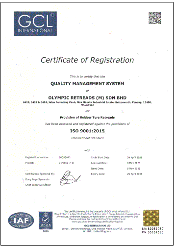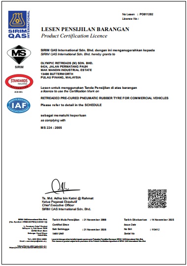 We are certified by SIRIM under the Product Certification scheme for Malaysia Standard MS 224 specification for Retreaded Pneumatic Rubber Tyres for Passenger Car and Commercial Vehicles.